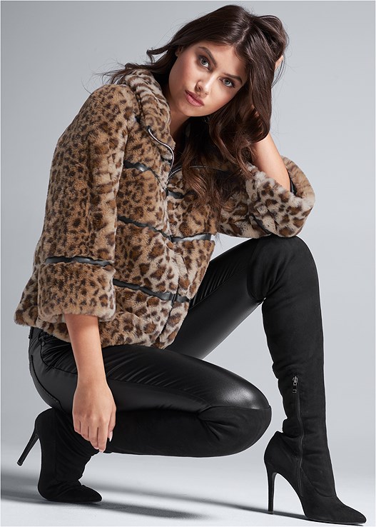 Maybe it’s the faux fur keeping you warm, or maybe it’s your own fiery fierceness that ignites when you throw on this statement piece! The cropped style and animal print are wildly hot this season, and with the exaggerated collar and tough chic faux leather trim, you’ll bring the heat where ever you go.