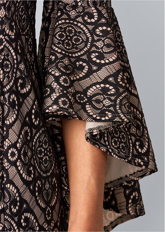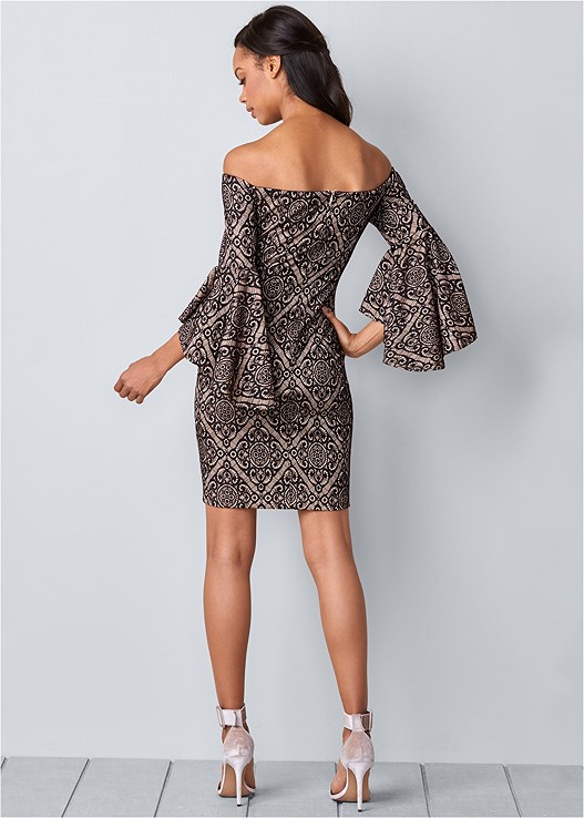 This is one sweet silhouette! Though the fabrication and pattern may vary, the sophistication does not. This off the shoulder Sleeve Detail Dress is easily your best party solution. The bodycon style paired with the dramatic flounce sleeves and side skirt slit throws a sexy spin on this classic shape.