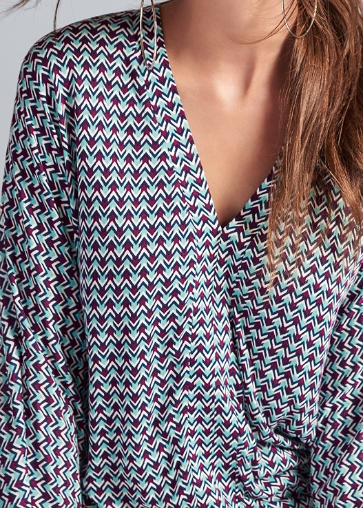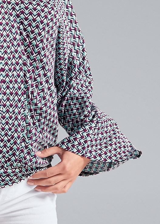 Upgrade your “desk to dinner” wardrobe when you add this colorful chevron print to it! Keeping on-trend with its flared bell sleeves and surplice styling, this vivid top features a banded bottom, which keeps the look put-together and makes for easy tucking into sleek dress trousers or a ladylike pencil skirt.