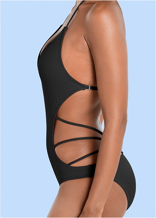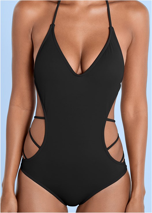 This deep V-neck monokini is cut close on the sides but features hidden pockets with shaping cups for lift and support. The side cut outs have thin straps that stretch on both sides to the center of the low cut bottoms.