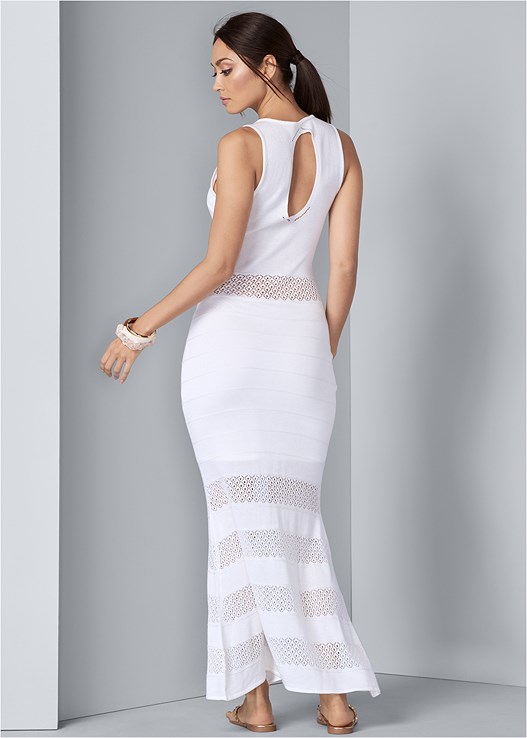 Boasting a comfortable fit to enhance your curves and sensuous open crochet to expose a little extra midriff and leg, this sleeveless, mermaid fit is minimalism to the max!