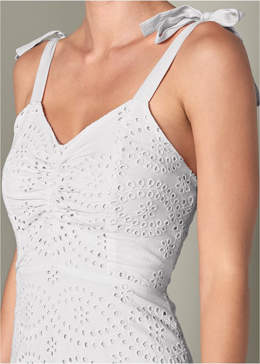 Enjoy this season’s go-to look of all-over eyelet! This fully lined sun dress features a flattering high-low hem with a fun and flirty flounce! Ruched detailing at the V-neck bodice and pretty ties on the straps balance this look from top to bottom.