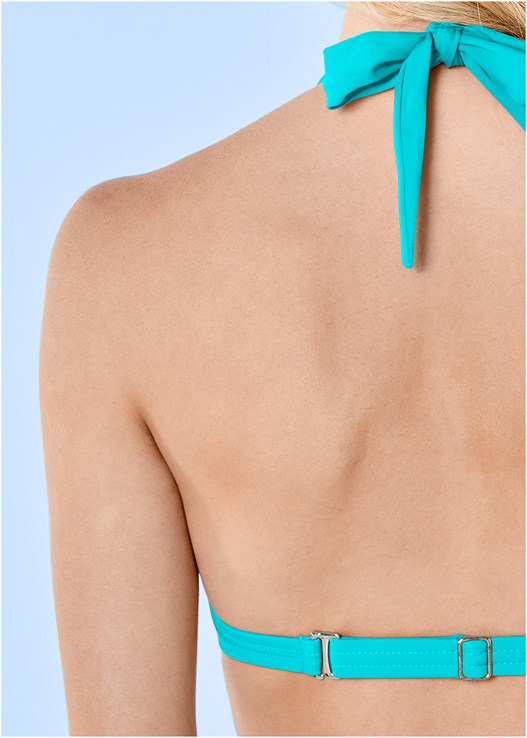 With feminine styling that shapes and supports, this timeless bikini top features the exclusive Venus slider back strap that adjusts for a custom fit. The molded cups with supportive underwire and built in push up enhance and add curves. The soft fabric sashes tie behind the neck for a personalized fit.