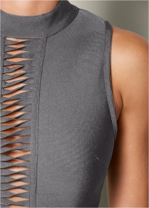 Conquer any occasion with confidence in this iconic, slimming Venus Hold U In bandage style dress. Item features a slit of strappy details at the bust and down to the midriff.