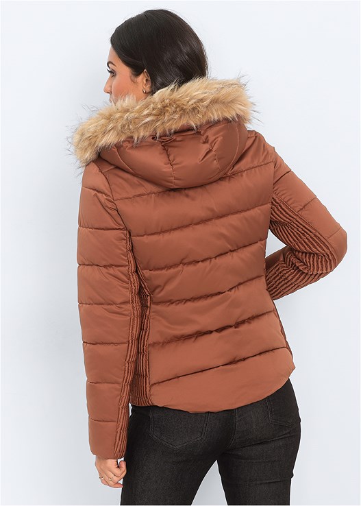 This waist-length puffer-style coat features a cozy, fur-trimmed hood. The front zip closure locks in warmth with zippered side pockets for security. To break up the volume of this casual jacket, inserts of ribbed fabric line the sides and underside of the sleeves.