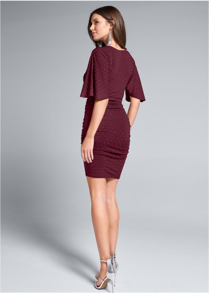 Be the life of the cocktail party with the sparkling flurry of rhinestones that adorn this Embellished Flutter Dress. The flattering V-neck, bodycon styling, cut in a flirty short length, gets added charm with gently flowing sleeves that flounce along with your dancefloor moves.