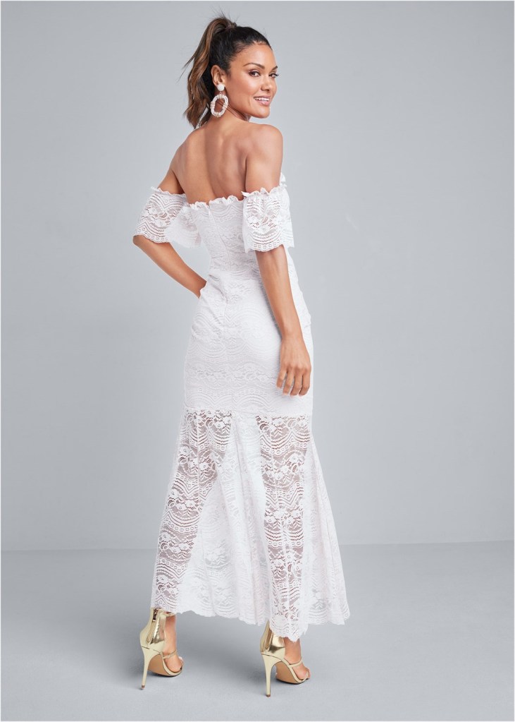 For breezy date nights to garden parties, this Off Shoulder Lace Dress is a such a romantic look. The bodycon silhouette and curve-enhancing ruching flatters your figure, while delicate lace and frilly scalloped edges keep the overall vibe feeling playful and sweet.