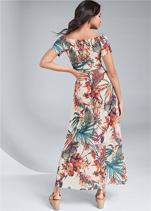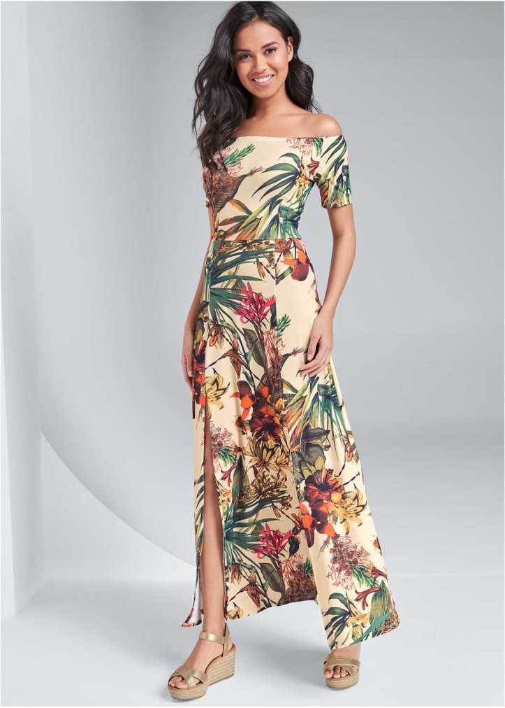 A memorable style for your memorable getaways! Take to your vacation destination in a classic tropical print, complete with a very stylish off-the-shoulder bodice and alluringly high slit at the skirt. Not time for vacation yet? No worries, this gorgeous style is fit for any casual glam occasion, from Friday night cocktails to Sunday brunch!