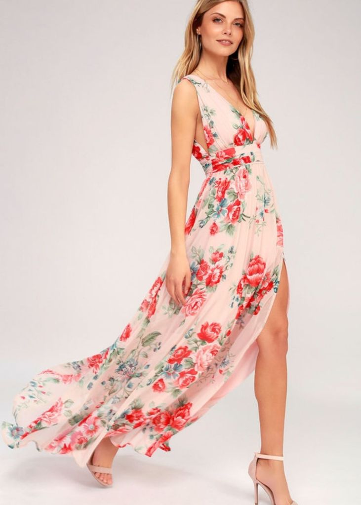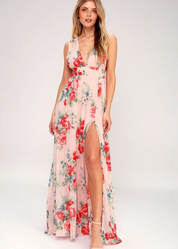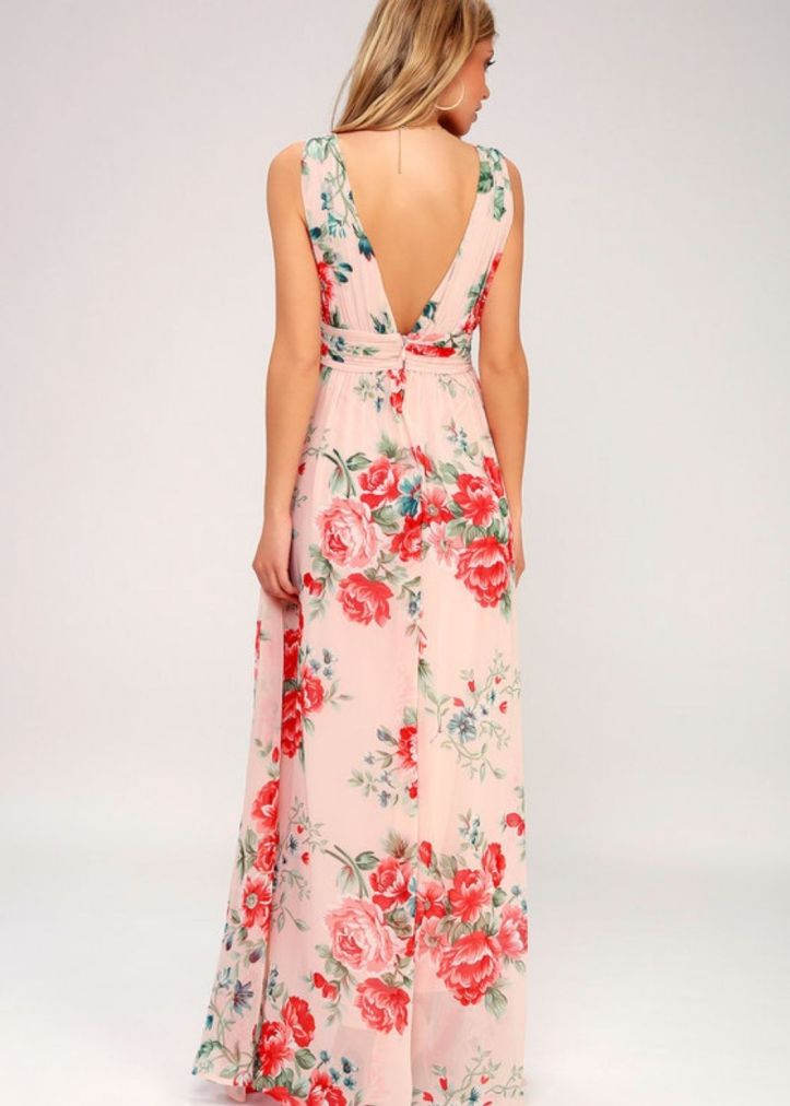 Get lost in all the dreamy details of the our Garden Meandering Blush Floral Print Maxi Dress! Chiffon, with a coral red, pink, and green floral print, forms wide straps (with hidden no-slip strips) that flow into a plunging bodice. Sweeping maxi skirt, with a side slit, falls below a gathered waistline. Hidden back zipper/clasp.