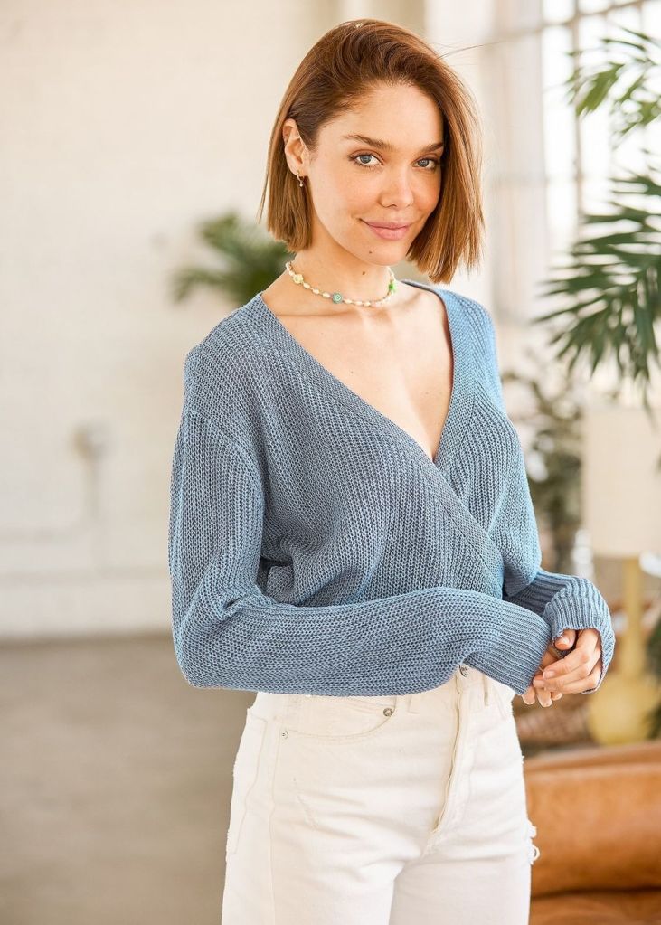 Think Twice Slate Blue Surplice Reversible Sweater takes versatility to a whole new level! This cozy loose knit sweater really can do it all with its flattering bateau neckline and long sleeves with drop shoulders. Flip it around to reveal a plunging surplice neckline, perfect for showing off a peek of your favorite bralette!