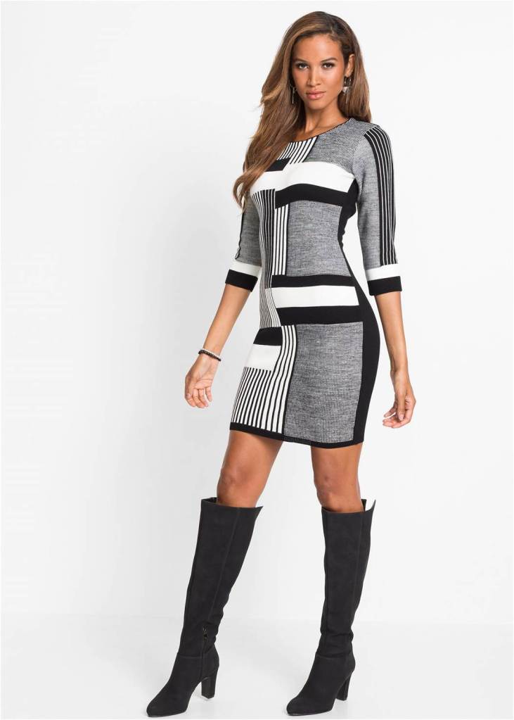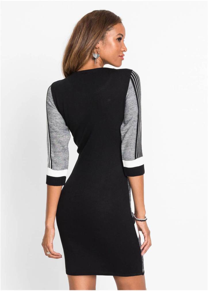 Trendy stripes and color blocking in bold, contrasting colors create an appealing bodycon dress at a sexy mini length to give you that legs-for-days look. A scoop neck and 3/4 length sleeves cover just enough skin to make this sweater dress an easy one to choose for any occasion.