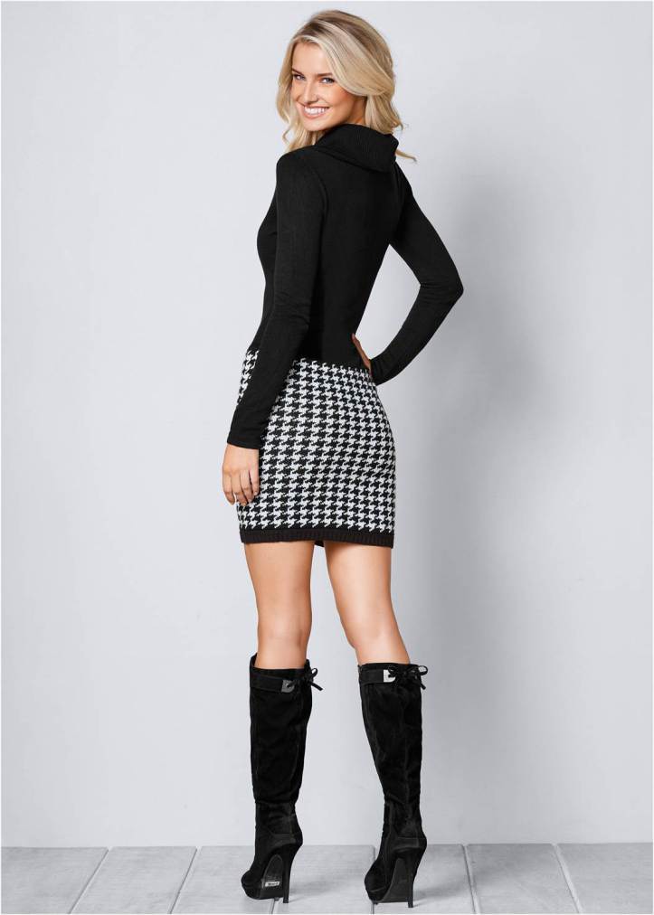 Make them sweat when they see you in this Printed Sweater Dress. The houndstooth design of the skirt draws attention to the swell of your hips, while the slimming black top piece minimizes any trouble zones. The mock shawl neckline gives a nod to more classic designs, without overwhelming the overall look of the garment.