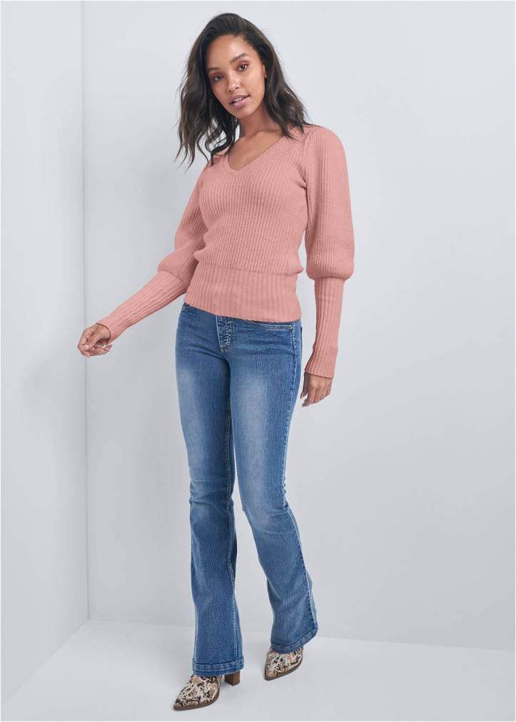 This classic ribbed sweater takes you through the day in an easy style. The flirty V-neck makes the perfect frame for a sparkly necklace, while the fitted bodice adds sexy coverage that finishes with a wide ribbed hem. Puff sleeves give you room to move with a long, tight cuff to match the hem.