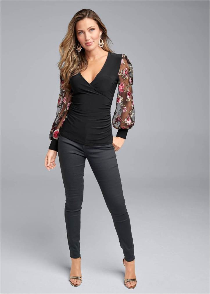 Flatter your figure in this surplice-style low-cut top with sheer balloon sleeves that boast feminine floral embroidery detail from shoulder to wrist. The fitted cuffs and curve-hugging appeal at the hips finish this elegant look that balances your silhouette with its hint of a puff at the shoulders.
