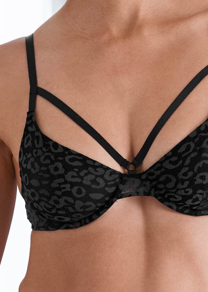 With strappy details and leopard-printed lace, this three-piece lingerie set brings edgy appeal to your romantic evening behind closed doors. Garter straps that are attached to the sheer skirt adjust, with coordinated strappy details at the lined bust that tie the romantic look together.